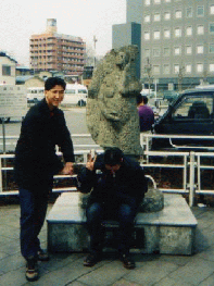 大谷石を前ににこやかポーズの羅津挙U世と、像の後ろの裏ボス!