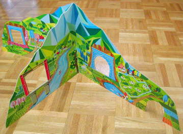 ボール紙の両面にカラー印刷されているのは、都会の景色と田舎の景色