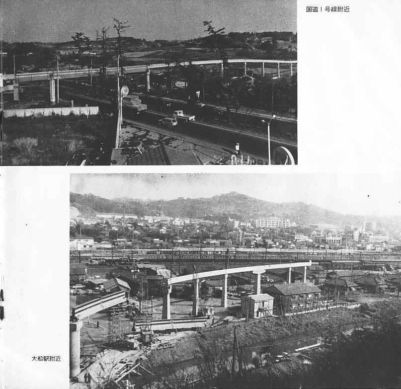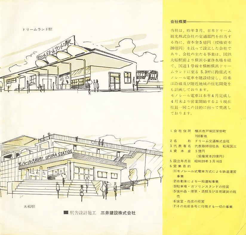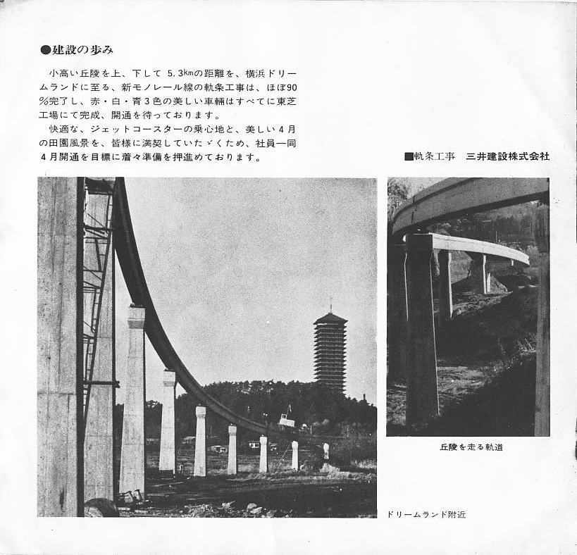 大船線と、予定路線の長後線の載ったイラストマップや、建設中の貴重な写真、そしてドリームランド駅に搬入直後のモノレールのカラー写真と見どころも満載です