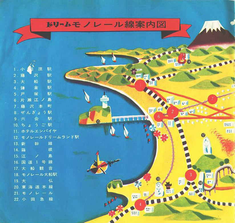 | モノレール線案内図:イラスト風の、なかなか楽しい図案となっています(小雀の信号所までちゃんと書き込まれています) 小田急線方面のモノレールの延伸予定先が、当初の六会から長後に変更されているのが目を引きます(何か理由があったのでしょうか?) |