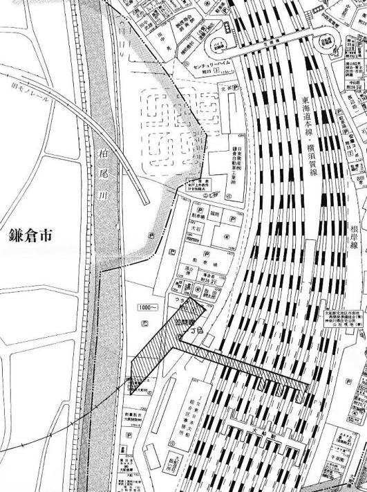 ↓大船駅付近の拡大図です:現在のものとは違う大船駅への進入経路や、国鉄ホームへの連絡橋がはっきりと描かれています