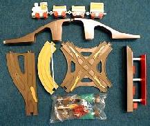 複線踏切1セット、パネルステーション2セット、自動発車駅1セット、単架線12コ、複架線3コ、信号2本、立木6本、吊り橋3セット