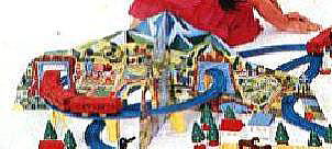かなり初期のストラクチャーです。厚紙(両面に都会と田舎の情景が描いてある)2枚を組み合わせて、右下の写真のようにレイアウトに組み込みます。30年以上前の物でしょう。個人的には、昔持っていたような記憶があり、見た瞬間懐かしい思いがしました。