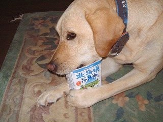 ヨーグルトを与える場合はその殆どが「おこぼれ」状態で、食器を洗う必要がないくらいまでにきれいになめてくれます。 右の写真はヨーグルト容器に少し残したヨーグルトをなめている様子ですが、容器が深いために鼻をつっこんできれいにします。 最後の一なめには容器をビリビリに引き裂いてしまいます。