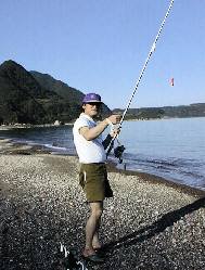 例年通り、夏休みは佐渡島で過ごした。今年は家内の父の不幸があり、納骨 と新盆のためにそうそう釣りばかりはやってられない。家内の妹の亭主も釣り 好きで、多忙な女房達の許しを得て、二人で投げ釣りに行って来た。 ポイントは、彼、板井さんが持ってきた釣り雑誌の切り抜きによると、佐渡 島の北に位置する関港。 記事には「20cm級のキスが群れて泳いでいるのが見える。」とある。話 半分としても期待をしてしまう。 毎年、本町商店街の「近藤スポーツ」でエサのアオイソメや仕掛けを買って いたが、寂しいことに今年は店をたたんでいた。R350沿いにそこそこの規 模の釣具店があるというので、車でひとっ走り行ってみた。規模的には我が家 の近所の「上州屋」並みで、渓流・磯・沖となんでも揃っている。この店「本 間釣具店」でジャリメを購入した。 当日は4時起き。まだ暗い道をヘッドライトをつけて、一路北上する。途中 対向車にめったに会わない。相川を過ぎると交差点の信号機もほとんどないた め、1時間ちょっとで関港に到着。堤防の上には誰もいないが、堤防の下の段 では家族連れがコアジを釣っている。近くの磯からも数名がサオを出している。 メジナかクロダイ狙いか? 我々しか上がっていない広い堤防から、堤防の延長線上に向かって仕掛けを 投げる。雑誌の情報では沖方向には根があるとのこと。 コアジを釣っている家族連れから「キャーッ! また釣れたー。」と嬌声が 上がる。ところがこっちには、いくらさびいてもキスのアタリはこない。1時 間ほどねっばたが、メゴチとベラが数尾釣れただけ。6時過ぎると、気温も高 くなってきたので、ここをあきらめて場所を変えることにした。 あの雑誌の記事には、風が出たときには「関港」での釣りがお勧めとあり、 風がなければ、「関港」のちょっと北よりの「五十浦」や「岩谷口」の方が好 ポイントらしい。 ほんの5分ほど走って、「岩谷口」に着いた。ここは砂浜の海岸線が長く、 海水浴場になっているらしく、駐車場やトイレも整備されている。まだ時間が早いためか、広い海岸線には数人の人影が確認できる程度で、釣 り人は、ヒラメ狙いかキャスティングを繰り返している人が一人と、遠目に投 げ釣りらしい人影が一人見えるだけである。 冷えたコーラを一口飲んで、気分一新、沖合へと投げ込む。先に投げ込んだ 板井さんに早くもアタリが来たらしく、ゆっくりとリールを巻いている。何と 3本針の仕掛けに3尾のシロギスが付いている。ここで記念撮影。