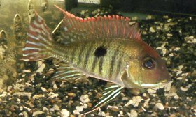 | 昔はレッドゲオファーガスという名で入荷していたこともある。ゲオファーガスの代表的ともいえる種だった。 スリナメンシスとしては体側に入る黒斑が小さいので"cf"とした。 |