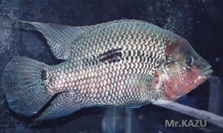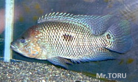 | 通称サウスアメリカンシクリッドという名で売られていることが多い。 自然下では60センチ以上にもなろうかという大型種でしかも性格は極めて凶暴で、飼育は覚悟が必要。 ドヴィーと並ぶ豪傑シクラソマである。 名前からして南米種ではあるのだが、 中米のパナマと南米コロンビアのマグダレナ川にも生息している。中米のものは グリーンサウスと呼ばれるかなりのレア種。 成魚になると鱗のメタリックブルーに磨きがかかり、赤茶色っぽい頭部とのコントラストが見事である。 興奮時の雌は鰭が黒っぽくなり、体色は明るくなる。一方興奮時の 雄は全身の色が暗くなることにより、青い鱗が一層引き立つ。 人に慣れやすく、一匹飼いでもペットフィッシュとして楽しめるがエロモナスの感染に罹りやすいので 早期発見で治療を施してやりたい。 被写体上左が雄の亜成魚、上右が雌の亜成魚。因みに上左の個体と下左の個体は同一個体である。 なお、下の右の個体はまた別の雄である。 | |