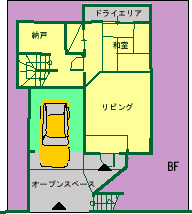 地下に玄関をもってくると、一階に玄関や玄関ホール部分のスペースが無くなり、 ダイニング等が意外と広く取れます。オープンスペースも立体的に使えばすてきな居住空間の一部になります。 敷地33坪/建蔽率50%/容積率100% 一階:15.5坪/二階:15.5坪/ 地下:12.0坪/車庫3.50坪/の建坪の家 建蔽率:15.5/33<47% ok 容積率: 算入分(12-(15.5+15.5+12.0)/3 ok 車庫の緩和 (15.5+15.5+12.0+3.50)/5>3.5 ok |