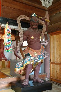 この観音堂の中にはなぜか 仁王さんがいてはります。 下の写真は、東隣にある金毘羅神社の鳥居ですが、鳥居の向こうに仁王門が見えまっしゃろー。 仁王さんたちはもともとここにお住まいでしたが、神仏分離で仁王門の土地が神社の所有になって以来、観音堂に仮り住まいしておいでです。 そういうわけで金毘羅神社は、空の仁王門を持つ、珍しい神社です。 |