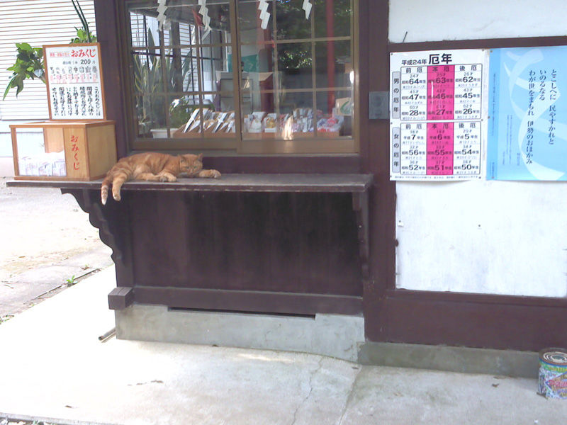 永福稲荷のおみくじ売場でくつろぐ猫。