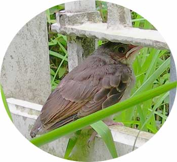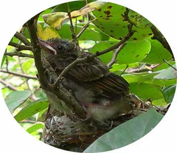母鳥が卵をくわえて庭を横切りました。 ???...やがて雛がかえるというのに。 涼しいところに引っ越しているのだろうかとガッカリしましたが。すぐ留守中の巣を覗いてみましたら、なんと雛が生まれているではないですか。 |