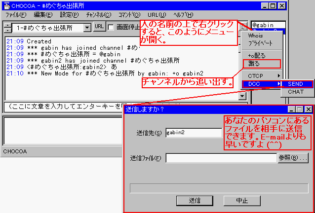 ファイル送信、チャットから追い出す(蹴る)、二人きりで話す、 チャンネルリストを表示するなどあります。 人の名前の上で右クリックしたり、「コマンド(O)」などから選ぶ事ができます。 参考に画像を見て下さい。画像1、画像2