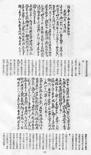 ![]() 指布等為音物被持越 候 永禄八年七月頃 一、鹿角侍に廻文ニ加判 仕候仁大里備中花輪 柴内相模守此三人安 保衆と申侯尾去之安 保左衛門太夫小平大 湯此者共ニ御座候 一、加判にのり不申もの 鹿角旗頭石鳥屋九郎 正友長牛縫殿助谷内 弾正小枝指左馬助毛 馬内此衆申侯ハ先祖 ノ家督主君信直様逆 心仕間布(敷)迚連判不仕 侯付近季勢(ママ)為勢申覚 一、永緑九年九月頃秋田 勢由理七騎衆松前守 護蛎崎阿仁神成比内 勢并鹿角逆心之者一 所ニ罷成先陣二正友 申城リ(ママ)責申候故石鳥 屋城ニ為見付長牛 縫殿助谷内弾正籠城 仕戦候得共寄手大勢 故数度合戦ニ而石鳥 屋之城落居正友も長 牛居城籠秋田勢待申 事 一、永禄九年秋より手合 節々取合申候得共落 不申侯而長牛城ニ籠 侯而働申者縫殿助一 門与九郎采女之尉最 上牢人掃部之尉此三 人軍大将其外来釆中 館三郎左衝門大賀蜂 丹後羽高与惣夏井不 動院秋羽三川越山作 内縫殿介伯父弥九郎 民部之尉親太郎左エ 門ハ老武ニてさいと り下知仕候一戸弥兵 衛作意其外石鳥谷村 長内村三ケ田村夏井 村熊澤人数籠城仕候 而合戦仕候有時安保 三人之衆矢文一首長 牛城江打付候歌 |