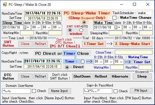 Sleep-Wake] を押すとTimerが動き出し、 SleepTime が来るとSleep する。 Sleep後は TaskScheduler にお任せで、WakeTime になると復帰する。 インストール時に一度 だけSCHTASKSのコマンドに DomainUserNameとSignInPassWordが必要なための入力 と 作成した wake.xml を C:\
