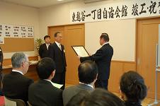 会館建設を担当した業者の方と工事監理に尽力された畔上委員に感謝状をお渡ししました。