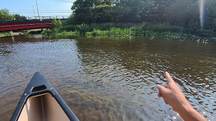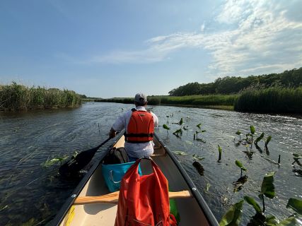 「黄色い花が咲いています。コウホネといい漢字では『河骨』と書きます。根が白くごつごつしていて、川底に骨がある様に見えるからなんだそうで、漢方薬にも使われます」と專齊さん、丁寧に説明してくれます。私はというと写真パチパチばかり。気が付けばパドルは足元、全く漕いでいません。「すみません、何にもしなくて」と言いつつも、何もしない楽ちんな川下りに大満足。漕いで早く進むより、何もしないで少しでも長い時間カヌーに乗ってる方がいいって感じ。向かい風が吹き專齊さんは大変でしょうが、お任せでのんびりさせていただきましょう。