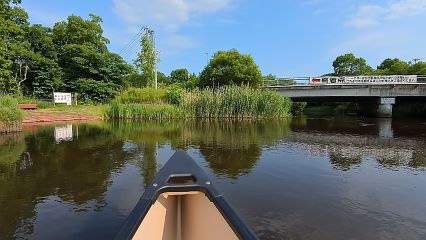 「うわぁ気持ちいい。やっぱカヌーはいいな、川はいいな」笑顔で声が弾みます。「前回はここでキャンプしたんですよ。こんなに木は生えてなかったです」と、橋手前右岸の茂みを指差します。橋の下流側左岸の大きなログハウスを見て、「前回キャンプの晩ご飯ここで食べたんです。焼肉に生ビール、贅沢しました。懐かしいなぁ」と夢中でしゃべりまわってしまいました。ログハウスの写真を撮ってると、「あっちのレストランで食べている人がカヌーを見つけ、写真を撮ることはあるでしょうけど、その逆は初めてですよ」と、專齊さんはあきれ声。そして二人で大笑い。愉快、愉快。