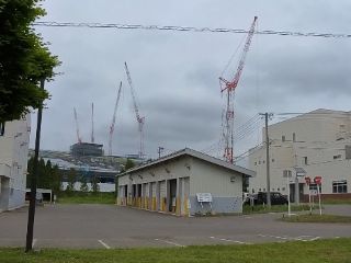 ラピダスを見てみよう。ここに来る途中、新千歳空港横の国道を車で走っているとき、何本ものクレーンが平原の中に立ち上がっているのが見えてました。あれはラピダスの建設現場に違いない。国道までのどこかで見えてくるだろうと、美々橋を後にし西へ進みました。すぐに工事エリアに着きましたが、入口にはゲートが設けられており、立ち入ることはもちろん、中を覗くことはできず、クレーンも見えません。仕方なく横の道へと進み、ビューポイントを探しましたが、立ち並ぶクリーンセンターの建物群が目隠しとなり、全く視界が開けません。とうとう一番奥まで行ってしまったので、空いたスペースに車を止め歩いてみて、漸く建設用のクレーンを見ることができました。新世代半導体の製造がうまくいき、周辺の環境も保全され、みんなの幸せが増していくよう思いを込めて眺めました。