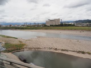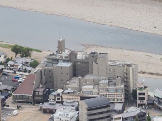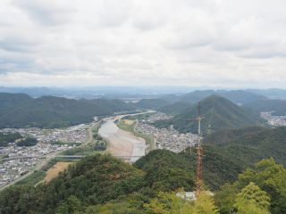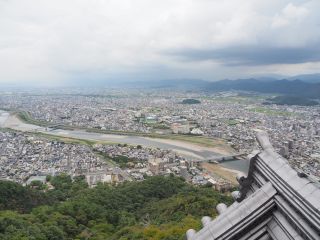 ようやくたどり着いた天守閣。桂くんはすっかり息があがっていて、外でゆっくり休憩するというので一人で中へ。展示品を見学しながら階段を上った4階が最上階で、廻縁に出て外を見渡しました。まず目に飛び込んできたのは長良川。北から流れてきて、一度は金華山に隠れますが、足元で再び現れ、悠々と南へ流れ下っていきます。足元に広がる砂の川原が鵜飼会場、すぐ左に長良橋が架かり、その下流側右岸にも砂の川原が広がっています。