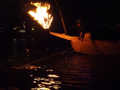 続いて総がらみへと移行。向こう岸近く、等間隔横に一列に並んだ6隻の鵜舟が、一斉にこちらに向かって動き出し、鮎を浅瀬に追い込みながら捕らえていきます。これが本来の鵜飼の姿だそうです。遠くで揺れる篝火が川面に映り、美しい光の筋となり目の前まで伸びて来ます。鵜舟が動き出し、篝火がみるみる大きくなって、飛び散る火の粉が見えてくると、熱も伝わってきました。鵜舟はもうすぐそこ。今宵のクライマックスです。