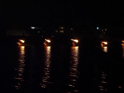 上流から篝火をたいた鵜舟が下ってきて、目の前へと差し掛かります。紐でつながれた鵜は潜ったり首を出したり。鵜舟の先に吊るされた篝火が闇を照らすと、ゆらゆら揺れる川面が炎に照らし出され、幽玄でとても美しいです。篝火が近くに迫ると炎の熱も伝わってきて、こちらも胸から熱くなります。通り過ぎた鵜舟は少し下流で折り返し、今度は観覧船と岸の間を遡ります。観覧船の右に乗った人も左側の人も、みんなが近くで見ることができるような運営ですね。これが6回。6人の鵜匠がそれぞれに腕を奮ってくれました。