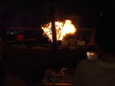 準備も整い、いよいよ出発という時、雨が急に強くなりました。バケツを返した様な降り方で、雨音も激しくなります。大丈夫だろうかと不安がよぎりますが、お構いなしで船は出発。不思議なことに間もなく雨は上がりました。鵜飼会場につくと、船は岸から少し離れたところに斜めに停泊されスタンバイ完了。鵜飼が開始されるのを静かに待ちます。