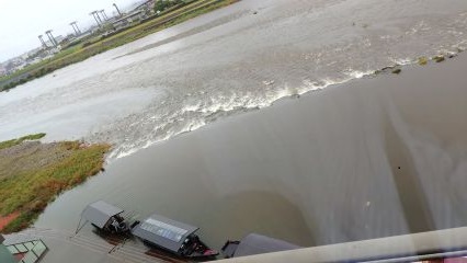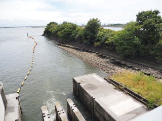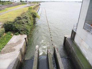 左岸の魚道部分を過ぎると調節ゲート部です。最初の2つ(調整ゲート1号2号)は少しづつオーバーフロー。中央部の6基(調整ゲート3号〜8号)は勢いよくオーバーフローで、轟々と流れ落ちていきます。そして最後の2基(調整ゲート9号10号)はまた少しづつオーバーフロー。手元の資料にある写真では、調整ゲート4号〜7号の4基が勢いよくオーバーフローです。今日は台風で増水しているためこの運用になっているのでしょうか。実際のところは定かではありません。約30分かけ河口堰を渡り切りました。