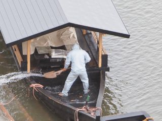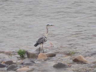 二日目は台風の朝です。前日発生した台風15号は、この日午前1時頃に高知県宿毛市付近に上陸し東へと進んでいて、台風東側の各地では、線状降水帯の発生が予想されています。ここ長良川でも、昨夜から続く強い雨で増水し、昨日見えていた川原はすっかり水の中です。当初は8時過ぎにはチェックアウトする予定でしたが、この雨の中を急いで出かけても仕方ないので、9時半発宿の送迎バスを利用し岐阜駅へ行くことにしました。少し時間に余裕ができたので、部屋から長良川&野鳥を眺め、楽しみながら過ごすことができました。昨日乗った観覧船にも雨水がたくさんたまり、船頭さんたちでしょうか、独特の形をしたスコップのようなもので水をすくい出しています。上流でえぐり取られた大きな生木が流されてきました。アオサギは雨などお構いなしで、流れの緩いところに集まる魚を探しています。