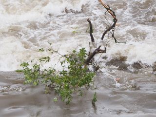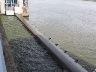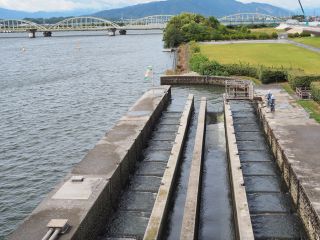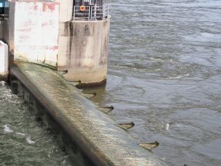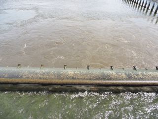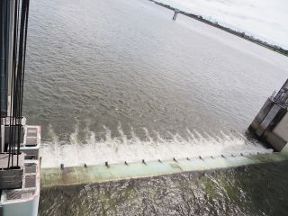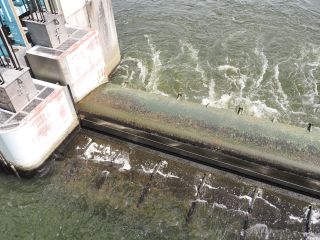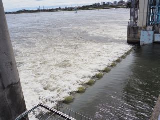 右岸から左岸へ戻る際、水門からモーター音がしてきました。何だろうと思い見ていると、下流側のゲートが水面から頭を出し、オーバーフローが止まりました。すぐにまたモーター音が聞こえだしたので、更に様子をうかがっていると、ゲートの下流側から激しく濁った水が沸き上がってきました。上流側のゲートが引き上げられ川底から離れ、アンダーフロー運営に切換えられたようです。各ゲートも同様にアンダーフローに切り替えられました。引き上げられたゲートの高さは、各ゲートで違っています。中央辺りでは、見えるのは水面上に出た下流側ゲートのみですが、左岸近くでは露出した下流側ゲートに加え、水面ぎりぎりまで引き上げられた上流側ゲートも見えています。アンダーフローで流れる量も多いためか、ゲート後の沸き上がりもそれほどではありません。