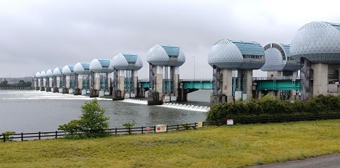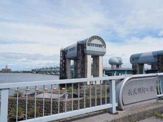 バス停の待合室を出て西に向かうと、すぐ目の前に河口堰の丸いキノコのような水門が見えてきました。「なんだ、こんなに近いのか」って拍子抜け。歩道橋を渡った先が「アクアプラザながら」。5分ぐらいで着きました。ちょうど雨が上がったので、中に入らず通り過ぎて、河口堰の前へと進みました。まっすぐに対岸へと延びる河口堰は延長661メートル。雨が上がったばかりのグレーの雲の下、普段より増水しているであろう長良川の水が、河口堰の中央付近を勢いよく流れ下る姿は、想像していたよりも雄大で激しく壮観です。