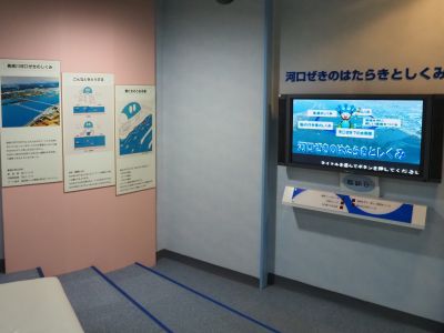 奥へと進むと「河口ぜきのはたらきとしくみ」というビデオ展示があります。「調整ゲートの仕組み」、「魚道の仕組み」、「河口堰での水利用」、「環境を守り新しい環境を作る」、「船の行き来の仕組み」と5つのチャンネルがあり、時間の余裕もあるので全てをじっくり鑑賞しました。