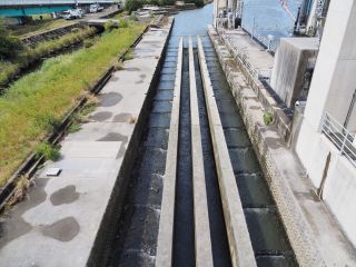 今度は右岸の魚道を見学。右岸のみにあるせせらぎ魚道周辺にはたくさんの草が茂っており、草刈り作業をしている方の姿が見えます。既に台風は過ぎ、普段と何ら変わることのない炎天下の作業です。台風一過でいつもの猛暑が戻ってきました。