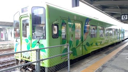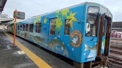 岩国駅でくぼっちと合流。0番線には既に錦川清流線の列車が停車中です。2両編成で、後ろの車両は黄緑色のボディーに大きくカワセミが描かれた「こもれび号 森林のグリーン」、前方車両は水色のボディーにアユ、オオサンショウウオ、アマゴなどが描かれた「せせらぎ号 清流ブルー」。素敵な車両を目の当たりにし、旅情が大いに掻き立てられます。