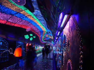 出発直後、目の前に開いたトンネルの黒い穴へと入っていきます。全長1796メートルの「きらら夢トンネル」です。途中には赤・青・黄・緑・白・桃の6色の光る石で描かれた壁画が続き、とても幻想的です。動く車内からシャッターを切りますが、なかなかうまく撮れません。まぁしょうがないねと思いながら眺めていたら、トンネルの真ん中あたりで停車。そこは360度壁画が施されているエリアで、「下車してトンネル内をご鑑賞ください。奥へ進むとプロジェクションマッピングもあります」とのアナウンス。これならばっちり撮れますね。観ても撮っても美しい、本当に素晴らしいです。