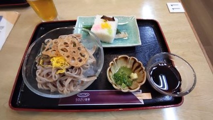 雙津峡温泉駅から未舗装の小さな道を下り、赤いつり橋で宇佐川を渡ります。その先の国道を横断し坂道を上ったところがSOZU温泉。天然ラドン温泉、源泉かけ流しの日帰り温泉施設です。ゆっくり温泉につかった後、館内でお食事。私は「岩国れんこん麺定食」を注文。岩国の特産品「岩国れんこん」はもっちりした触感で、一般のれんこんと穴の数が違います。一般のれんこんが8つなのに対し、岩国れんこんは9つです。その岩国れんこんを練りこんで作られたのが「岩国れんこん麺」。定食についている「錦寿司」も岩国特産で、きれいな押し寿司。どれもとってもおいしかったです。