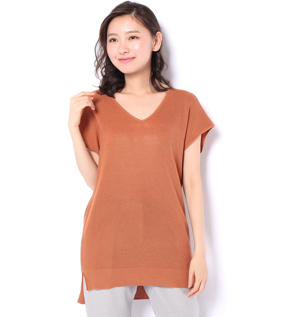 【送料無料】 さわやかな着心地の畔編みニットです。すっきりとみせてくれるVネックと、切り替えのないフレンチスリーブが大人カジュアルな雰囲気。さりげなく腰回りをカバーしてくれる後ろ下がりのデザインや、抜け感のあるサイドスリットなど、こだわりのディテールです。シンプルで女性らしいシルエットを叶えてくれます。 ドゥドゥ/DouDou トップス|ニット・セーター