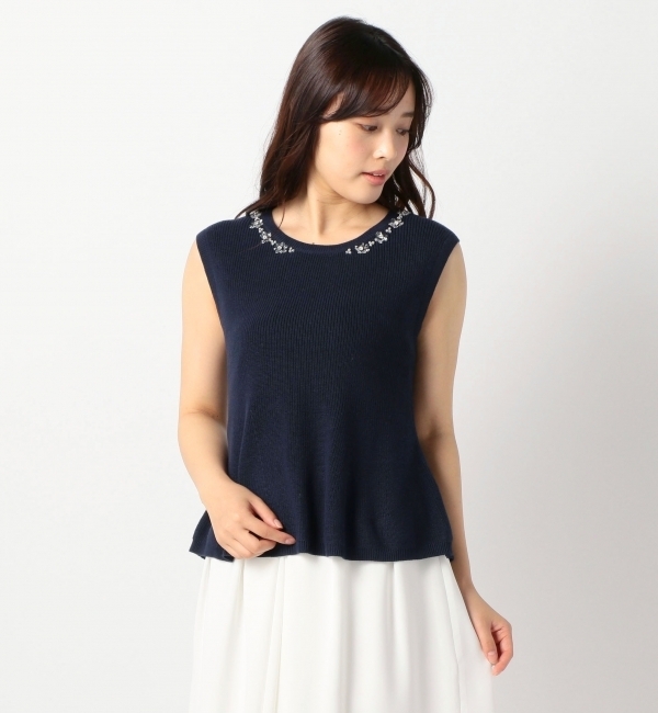 【送料無料】 シンプルな中にもフェミニンなニュアンスで魅了するニットプルオーバーです。ネックラインのビーズ刺しゅうがリッチで愛らしいワンポイントに。Aラインによる裾のフレアが動きのある表情を生み出し、より女性らしい着こなしへと導きます。 ミッシュマッシュ/MISCH MASCH トップス|ニット・セーター