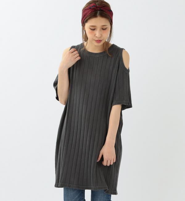 肩開きリブチュニックワンピース/AEBC カタアキ RIB チュニック OP
