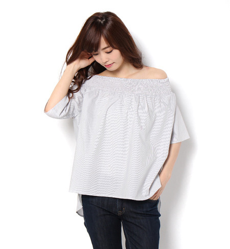 【送料無料】 オフショルダーでデコルテや肩をすっきりと出し、身幅の広いシルエットでボリュームをプラスしたブラウス。袖もトレンド感のある5分丈に仕上げました。無地のようにも見える細かなストライプ柄が爽やかな印象を与えます。シャツライクなコットン混素材を使用しているので、さらっと軽い着心地。 エモダ/EMODA トップス|オフショルダー