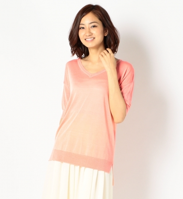 【送料無料】 Vネックの五分袖プルオーバーです。リラックスムードがありながら、テールカットデザインの裾でトレンド感もおさえたスタイリッシュな一枚。着丈は長めですが、袖が五分丈なのでバランス良いスタイリングが出来ます。 ミューズ/Mew’s トップス|ニット・セーター