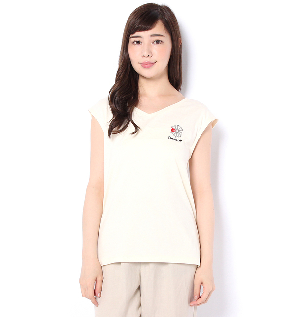 【送料無料】 スポーツブランドで有名な「Reebok」とコラボしたTシャツです。ノースリーブでVネックタイプなので腕周りも首まわりもすっきりとした印象に。胸元にはロゴが、バックにはハートのロゴがプリントされています。レイヤード風スタイルのインナーとしても◎ カスタネ/Kastane トップス|Tシャツ・カットソー
