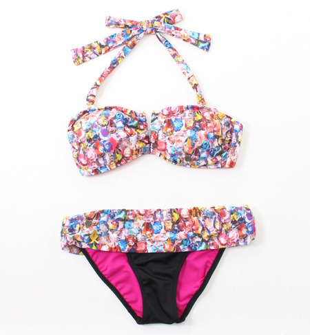【送料無料】 グラデーションの様な色の入り方が鮮やかで、ビーチで映える事間違い無しのジュエルプリントのバンドゥビキニです。胸元のゴールドの金具がポイント♪大人っぽく華やかな印象に仕上げました。 サンアイミズギラクエン/三愛水着楽園 水着・スポーツ|ビキニ