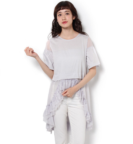 【送料無料】 カットソー生地のトップスにシフォンとフリルのドッキングがかわいいトップス。すとんとしたシルエットにカットソー生地が甘すぎない印象で、カジュアルに着ていただけます。シフォンの透け感にサテンのようなフリルが女子心をくすぐる1枚。あえてデニムでカジュアルに。今から着たいアイテムです。この商品は、デザインにより断ち切り始末になっておりますので、ほつれやすくなっております。お取り扱いには十分ご注意ください。 ライチ/ライチ doll up oops|トップス|Tシャツ・カットソー