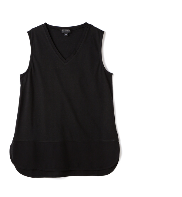 【送料無料】 裾にレーヨン素材を使用したドッキングノースリトップス!スタンダードをベースに、透け感のあるVネックや異素材ミックスで個性を加えたデザイン。ボディに沿ったシルエットで女性らしく、パンツやタイトめなスカートと相性良くスタイリングが組めます。 ジルスチュアート/JILLSTUART トップス|Tシャツ・カットソー