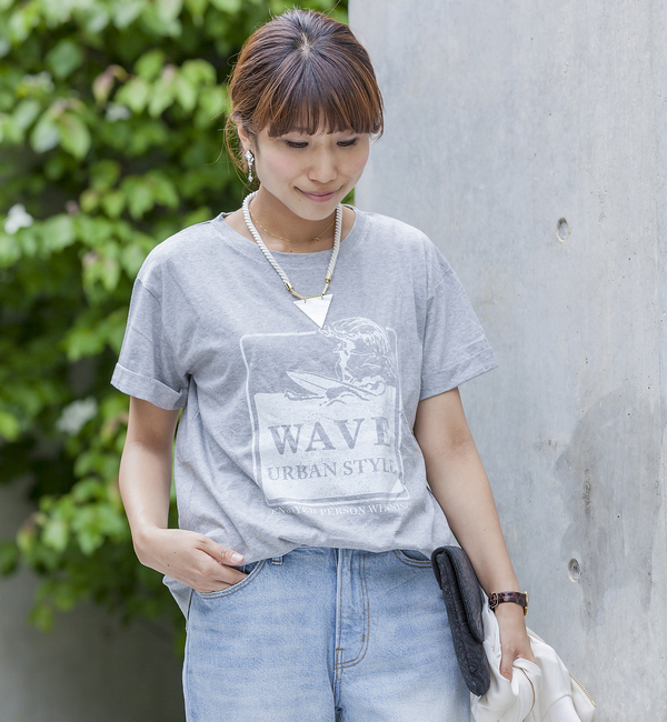 【送料無料】 サーファーガールのWAVEプリントがリゾートムード満点の半袖Tシャツです。スタイリングに抜け感をプラスするワイドシルエットもトレンドライク。袖口には折り返しを加え、裾はラウンドカットで軽さを出しています。すとんとラフに着こなすほか、ウエストインでふんわりとブラウジングさせても◎ ドゥドゥ/DouDou トップス|Tシャツ・カットソー