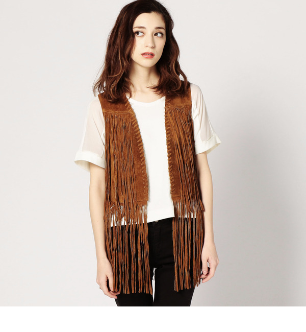 【送料無料】 ふんだんにあしらったフリンジがとっておきのインパクトを発揮するベスト。着る程に味わいを増す、スエード素材を使用しました。Tシャツ×デニムスタイルに羽織れば、瞬時にトレンドスタイルが完成。飽きのこないベーシックな1着です。※ご注意当商品は一枚革で裏地が無い商品となっておりますので、色移りする場合がございます。白や淡色のアイテムとのご着用はお避け下さい。 ローズバッド/ROSEBUD トップス|ベスト・ジレ