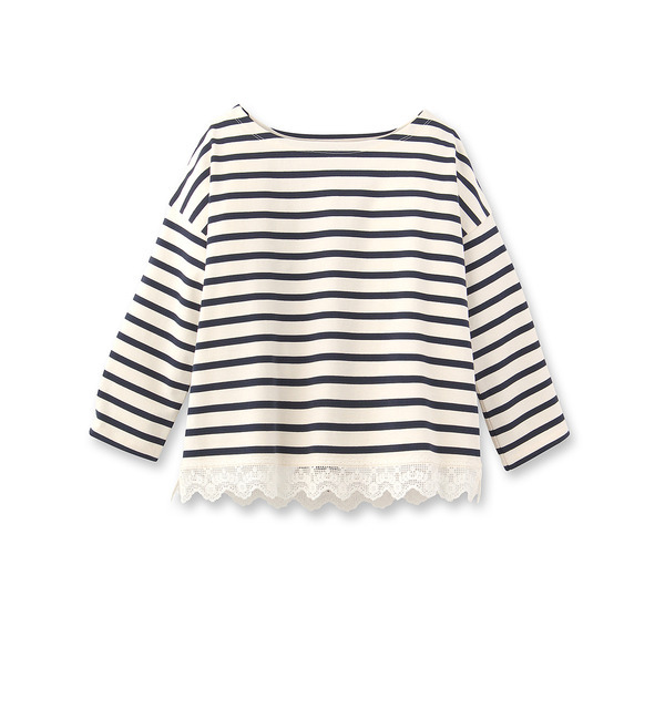 【送料無料】 マリンテイストのボーダーが可愛い七分袖カットソー。裾しらわれたレースがフェミニンでオシャレ♪ ボートネックで首元はすっきりと、裾につまみをほどこして広がりを抑えたデザイン。ショートパンツと合わせた裾のレースを強調した着こなしがオススメです。モデル情報:身長166cm B81W57H84 着用サイズ:38(M)店舗へのお問い合わせ商品番号:528-18302主に春に着用いただける商品です。日本製 アナトリエ/anatelier anatelier|トップス|Tシャツ・カットソー