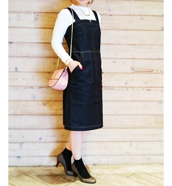 【送料無料】 ヴィンテージ風の風合いと、やや固めのデニム生地でしっかりとした印象を与えるジャンパースカートです。胸元のタックやタイトめなシルエット、膝丈レングスで子供っぽくなりがちなジャンスカを大人モードに仕上げました。ブラウスやタートルネックとの大人可愛いレイヤードスタイルがオススメです♪*この製品はデニム素材を使用しております。*摩擦や水濡れによる色落ち・色移りにご注意下さい。 ペルルペッシュ/Perle Peche ワンピース|ワンピース