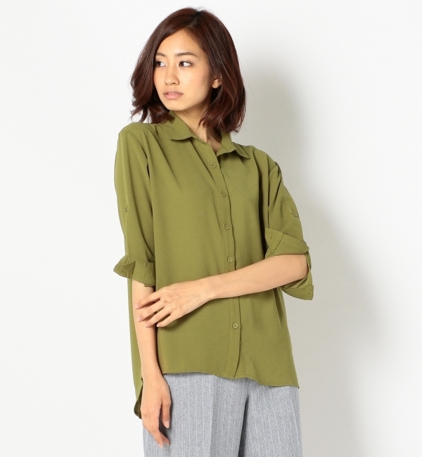 【送料無料】 着回しやすいベーシックなフォルムが魅力の7分袖ブラウスが入荷しました。ドレープ感のあるなめらかな素材とわずかに見える透け感が上品な印象の1枚です。ボタンが付いているので袖部分を折り返して5分袖にアレンジすることも可能です。 ミューズ/Mew’s トップス|シャツ・ブラウス