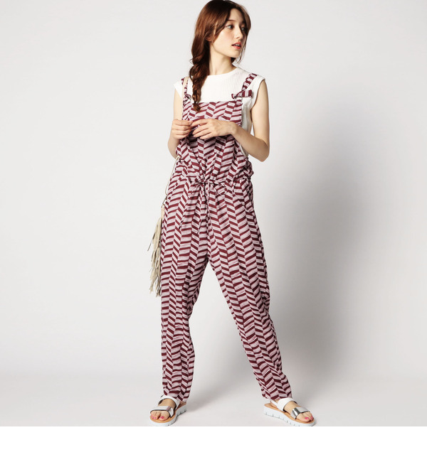 【送料無料】 軽やかな素材で夏にも着こなしやすいオールインワン。ほんのり和のテイストが漂うプリントが、おしゃれな存在感を引き出してくれそう。肩ストラップ下のリボンも、さりげなくキュートなポイントに。裾をロールアップして穿いても、バランス良く決まります。 ローズバッド/ROSEBUD パンツ|オールインワン